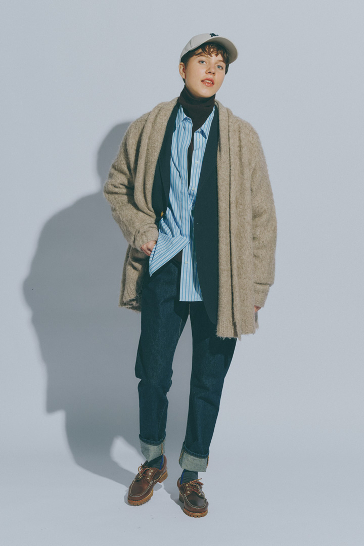 カーディガン¥58300/ASEEDONCLOUD(アシードンクラウド)、ジャケット¥39600 /J.PRESS ORIGINALS(J.プレス &サンズ 青山)、シャツ¥15400 /Rouge vif Anna(アバハウスインターナショナル オンラインストア)、タートルネックセーター¥30800/nicholson& nicholson(ナカガワ)、デニムパンツ¥16500/Levi’s®︎(リーバイ・ストラウス ジャパン)、キャップ¥4620/New Era®(ニューエラ)、シューズ¥25300/Timberland(VF ジャパン)、ソックス/スタイリスト私物