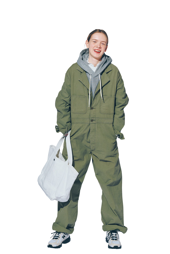 ジャンプスーツ¥47300/MASTER&Co(. マッハ55リミテッド)、フーディ¥26400/nanamica(ナナミカ D.W.S.)、ブラウス¥15180/MidiUmi( マザーズ インダストリー)、バッグ¥15400/ARMEN(ビューカリック&フロリック)、スニーカー¥15400/New Balance(ニューバランスジャパンお客様相談室)