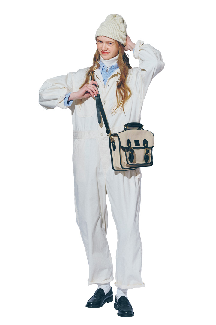 ジャンプスーツ¥22000、シャツ¥15950/ともにBEAMS BOY(ビームスボーイ 原宿)、タートルネックセーター¥48400/JOHN SMEDLEY(リーミルズ&カンパニー)、ニット帽¥6600/HIGHLAND2000、ソックス[6P]¥3740/THE RAILROAD SOCK(ともにメイデン・カンパニー)、バッグ¥64900/GLENROYAL(ブリティッシュメイド 青山本店)、シューズ¥78100/SANDERS(サンダース ジャパン)