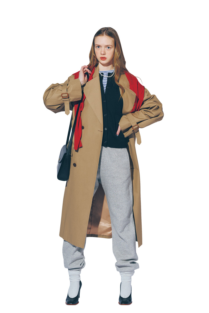 スウェットパンツ¥19800/THE SHINZONE(シンゾーン ルミネ新宿店)、コート¥90200/BRITISH MADE(ブリティッシュメイド 青山本店)、カーディガン¥39600/BATONER(バトナー)、Tシャツ¥13970/MidiUmi( マザーズ インダストリー)、肩にかけたカーディガン¥28600/Brooks Brothers(ブルックス ブラザーズ ジャパン)、ネックレス¥69300/MARIHA(マリハ)、シューズ¥58300/KATIM(カチム)、ソックス/スタイリスト私物