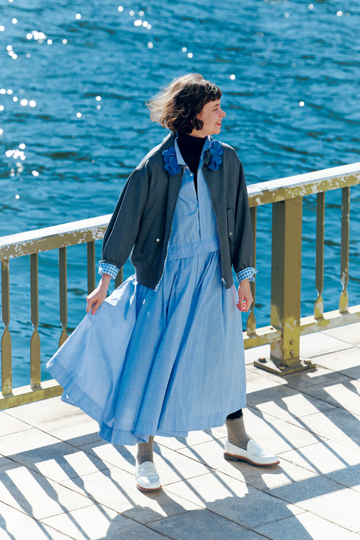 ウエストの切り替え部分にタックが配された《ヴェリテクール》のシャツワンピース。さて、どう着る? エアリーな広がりを堪能するため、ジャケットはショート丈。淡いブルーの爽やかさが際立つように、グレーをメインにやさしく色を引き締める。このように、シルエットや色使いにメリハリをつければ、装いはグッと洗練するのです。