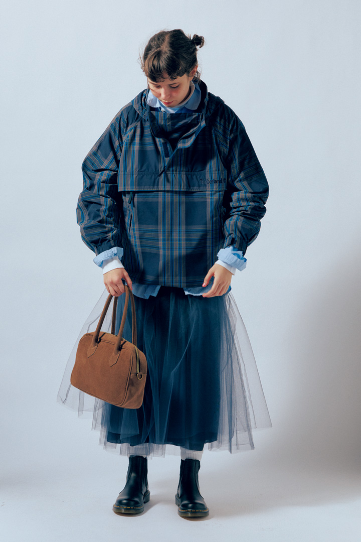 テイストMIX は色味をそろえると上手くいく。そんな方程式のもと、ロマンティックなチュールスカートとスポーティなアノラックジャケットをネイビーで統一。淡いブルーのシャツでグラデーションをつけつつ、白のカットソーやソックスを投入して、抜け感ときちんと感を加えよう。
