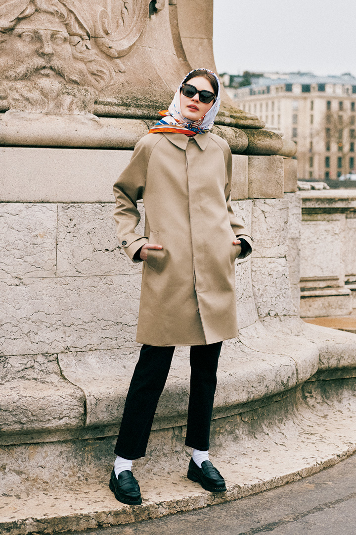 お手本は、映画『パリの恋人』でオードリー・ヘプバーンが演じたアメリカ人の女の子。パリに恋した彼女の自由なマインドを映すバルマカーンコートに、定番の細身のジーンズとローファーを重ねれば、いつもの着こなしもフレッシュな印象に。セーヌ川を吹き抜ける風にヘアを乱される前に、お気に入りのスカーフをサッと被れば、防御とお洒落が一度に叶う。まさに、パリを楽しむための一石二鳥なのです。
