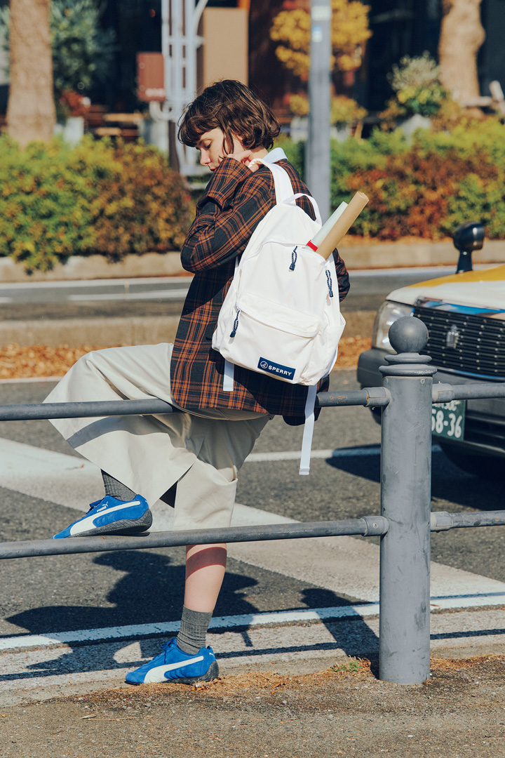 ジャケットとスカート。いつもなら仕上げはレザーバッグのところを、デイパックにシフト。すると着こなしにアクティブさが加わり、ほどよい抜けが生まれる。ボートシューズの元祖として知られるブランド、《スペリー》のデイパックは、デイリーに寄り添うミニマルな佇まい。パキッとした白でほっこり感も回避できる。