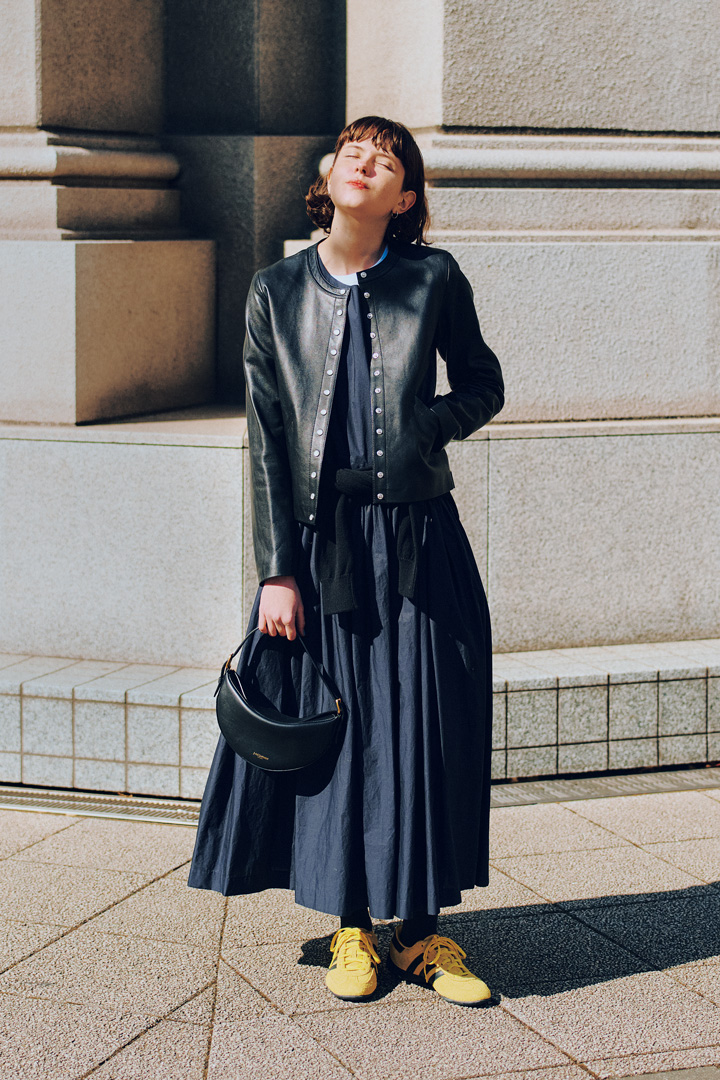 ジャケット¥330000 /agnès b.(アニエスベー)、ワンピース¥74800 / Scye(マスターピースショールーム)、腰に巻いたセーター¥30800 / SLOANE(ザ ショップ スローン 新静岡セノバ店)、バッグ¥103400 /J&M DAVIDSON(J&M デヴィッドソン カスタマーセンター)、スニーカー¥15400 /adidas Originals(アディダスコールセンター)、その他/スタイリスト私物