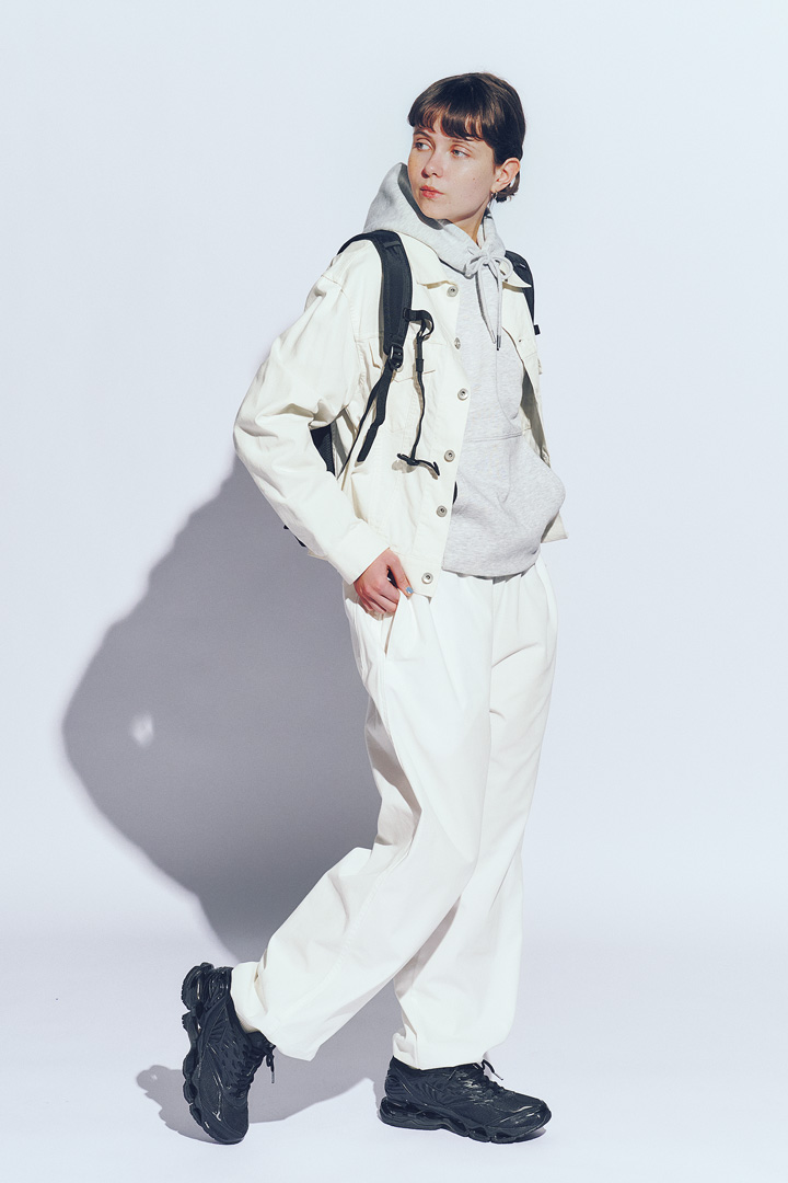 ジャケット¥41800、パンツ¥29700 /ともにY(イレーヴ)、フーディ¥4390 / ZARA(ザラ カスタマーサービス)、バックパック¥10780 /THULE(ゼット お客様相談センター)、スニーカー¥27500 / Mizuno(ミズノお客様相談センター)