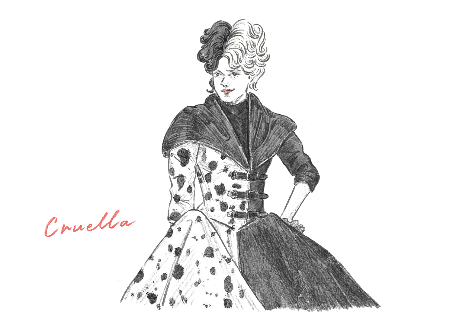 「モノトーン」はあるタイミングを機に、マイナスのイメージを払拭し、ファッションの先端へと躍り出た強さのある色であるとは、上でお話ししました。「モノトーン」の強さで思い出されるのが、アニメ『101匹わんちゃん』で自身の毛皮のコートを作るため、白に黒い斑点柄のダルメシアン(犬)たちを狙う、クルエラのファッションです。このクルエラを主役にし、彼女がなぜ狂気の女性になったかを描いた、2021年公開の実写映画『クルエラ』でエマ・ストーンが演じたクルエラのファッションを見ると、悪役の衣装とはいえ、アニメーション以上にリアルに、モノトーンコーデの強さ、かっこよさを見て取れる気がします。