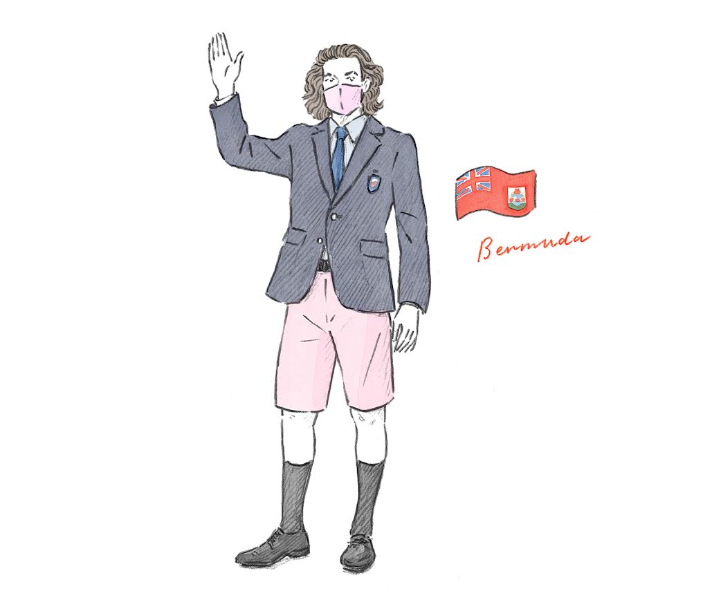 上の【歴史】で触れたように、本来はドレッシーによそおうアイテムである「バミューダ」。それは、オリンピックの開会式や閉会式で、バミューダ諸島から参加している選手の服装を見るとよくわかります。たとえば2020年に開催された、東京オリンピックではこんなふうでした。ブレザーに合わせたピンクの「バミューダ」がとてもキュートですよね。遊びが効いていて、ドレッシーでも堅苦しさがありません。