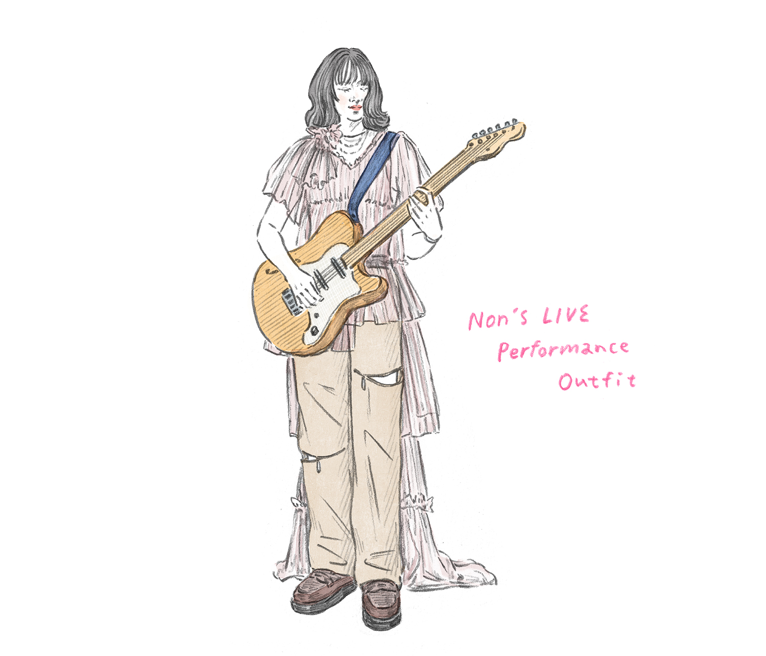 夏のある日。横浜の赤レンガ倉庫で行われた音楽イベントのステージで、のんさんはギター片手にパフォーマンスを披露。スポットライトを浴びて立つ彼女は、ブラウスとティアードスカートを組み合わせたような「チュール」のオールインワンを纏っていました。オールインワンの中は、ショート丈の白いタンクトップ×ベージュのダメージデニムパンツ。足元は厚底のローファーです。一見すると、ロックなテイスト、それでいて親近感を覚えるストリートスタイルだというのに、「チュール」のおかげで、間違いなくそれは、ドレス。人目を奪う華やかな雰囲気を醸し出していました。
