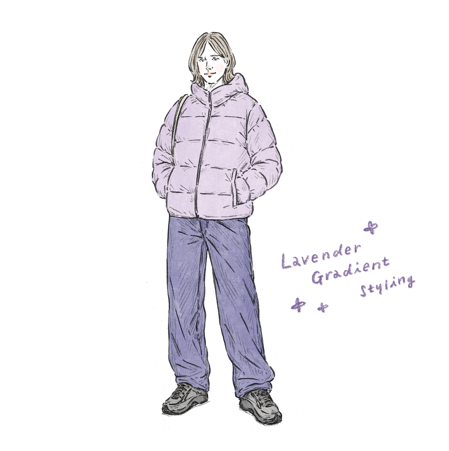 冬は街中にダークトーンの着こなしが増える時季。だからこそ、あえて明るい色を用いたコーデで着こなしの活性化をはかって!たとえば、こんなラベンダーカラーの「グラデーション」コーデはいかが? お手本は「グラデーション」をカジュアルに上手に取り入れているミア・レーガンやヘイリー・ビーバー。ボトムを濃く、トップスを淡くすると、たとえボリューム感のあるダウンジャケットを着ていても、スッキリ見えるのでおすすめです。明るい色をそのまま取り入れるのはともすると派手になりがちだけれど、「グラデーション」なら気負わずに着こなせます。この冬は「グラデーション」で気分を上げていきましょう♪