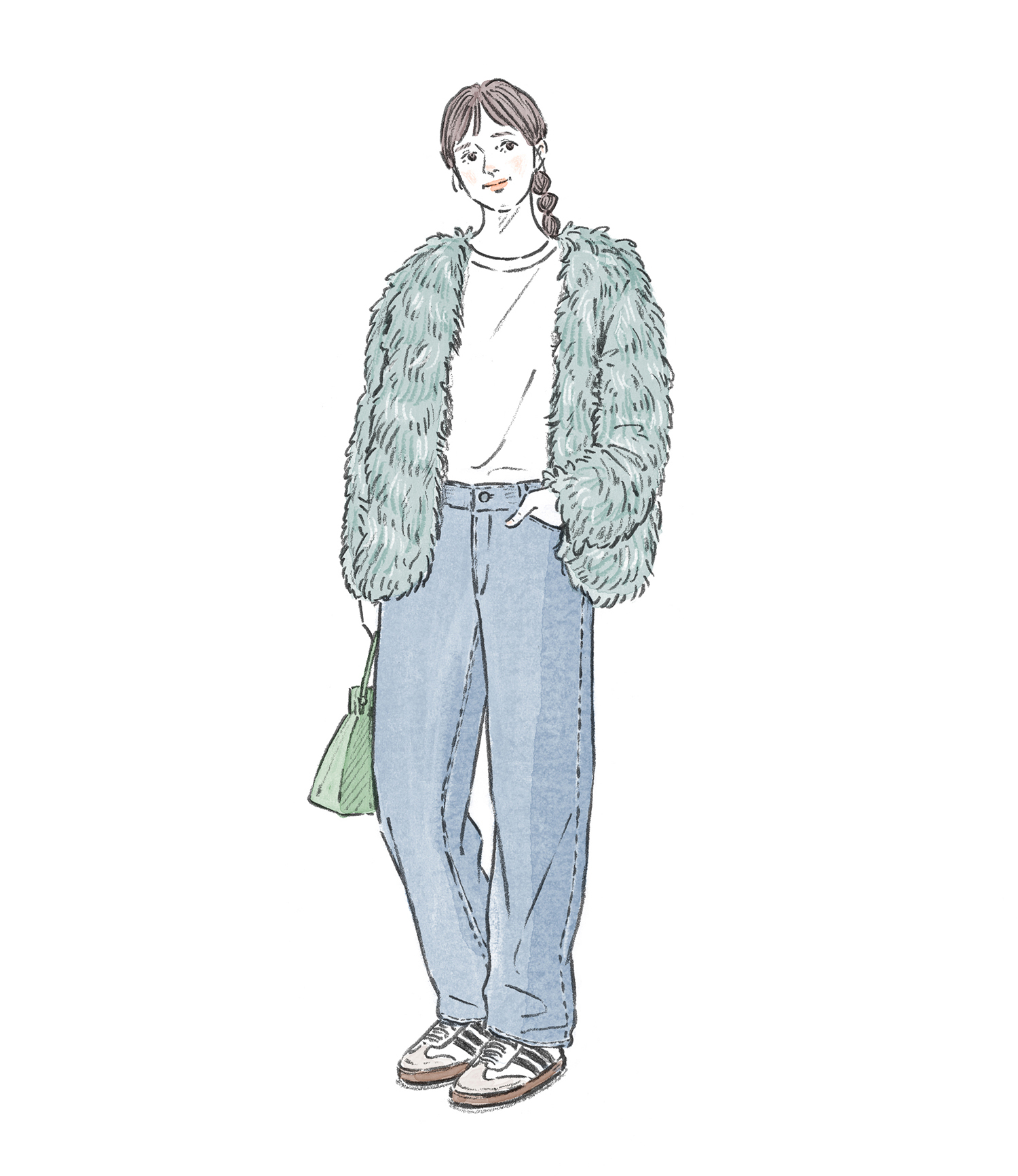 中はシンプルな白のトップス。足元はスニーカーやムートンブーツのような、自分らしいアイテムを組み合わせるのがおすすめ。いつもの延長線上で「シャギー」アイテムを楽しめるはずです。