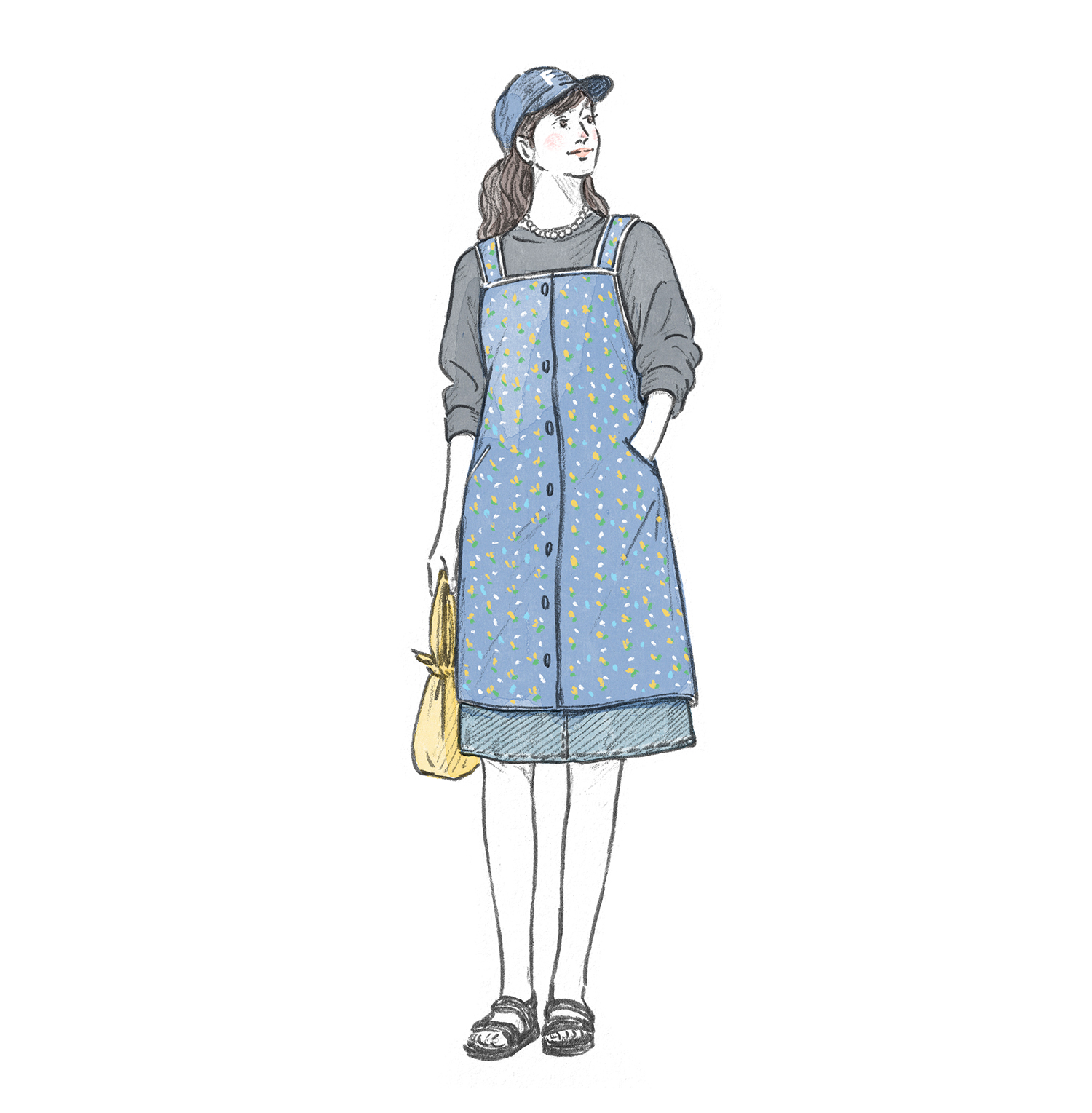 そこで参考にしたいのが、まるでワンピースのような佇まいのエプロンスタイル。太めの肩紐がどこかジャンパースカートを思わせるデザインは、いつもの着こなしに馴染みやすく、初心者さんにもおすすめのバランスです。