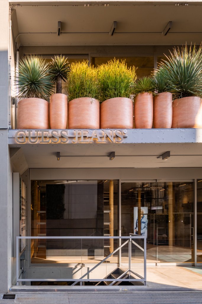 店内は、4フロア構成で《GUESS》の原点である南カリフォルニアの自然と、日本のクラフトマンシップと建築文化を融合させたデザインに仕上げているのがポイント。建築や素材、植栽に至る細部まで《GUESS JEANS》の美学を浸透させた空間となっています。外観は、ミニマルなコンクリートを基調に、《GUESS JEANS》がキュレーションする多彩なプロダクトやカルチャー、地域コミュニティを包み込む“器”をコンセプトに設計。地元の陶器と植物を組み合わせた外構は、地域に根ざすクラフトマンシップへの敬意を表現しています。