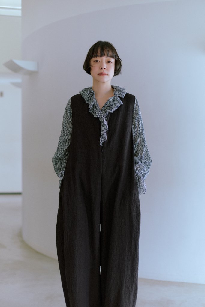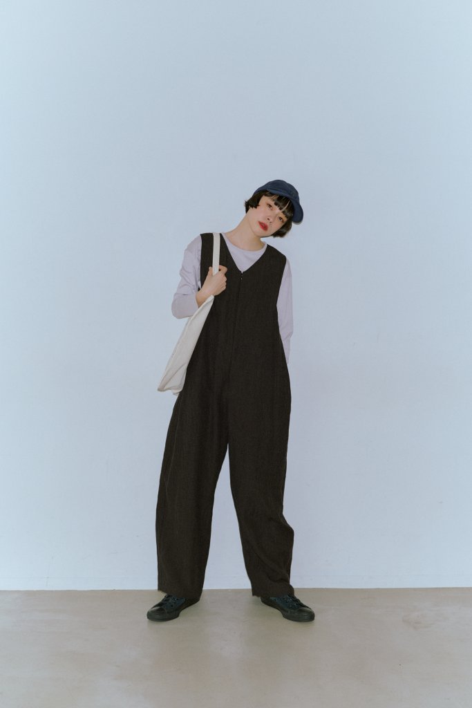 リネンに軽さと清涼感を出すため、いくつかの合成繊維をブレンド。立体的なボリュームを出した、エッグシルエットのサロペットパンツです。フロントはすっきりとした V ネックの着脱しやすいファスナー仕様に。リラックスして着られる一枚です。