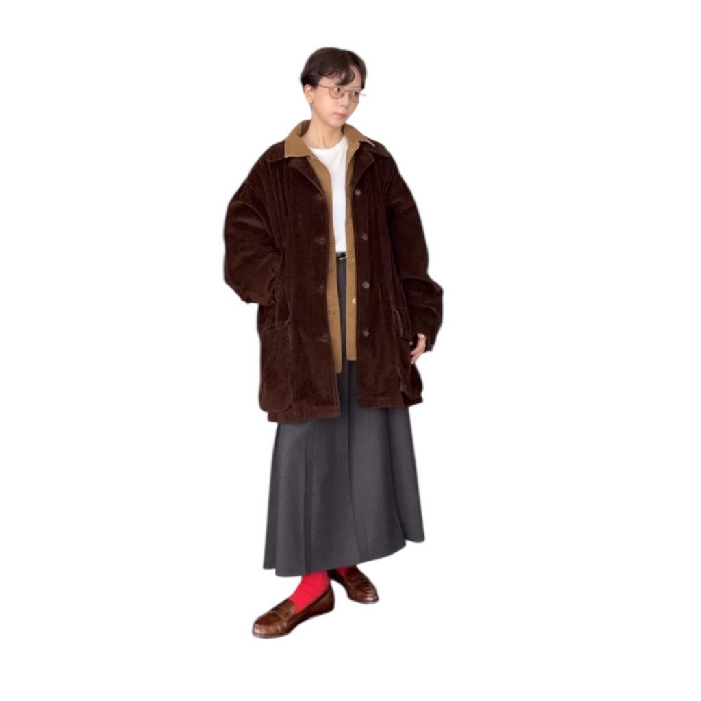 コーデュロイのジャケットをレイヤードしたスタイル。