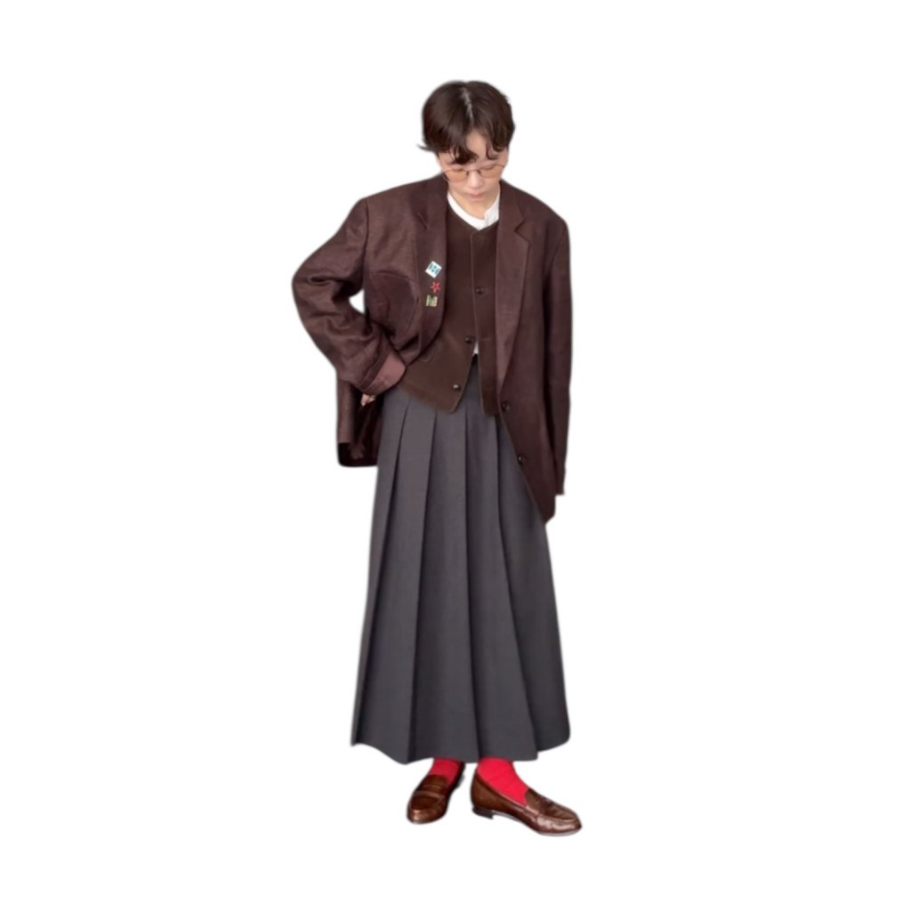 ブラウンとプリーツの相性は抜群ですがテーラードジャケットとの合わせも最高です