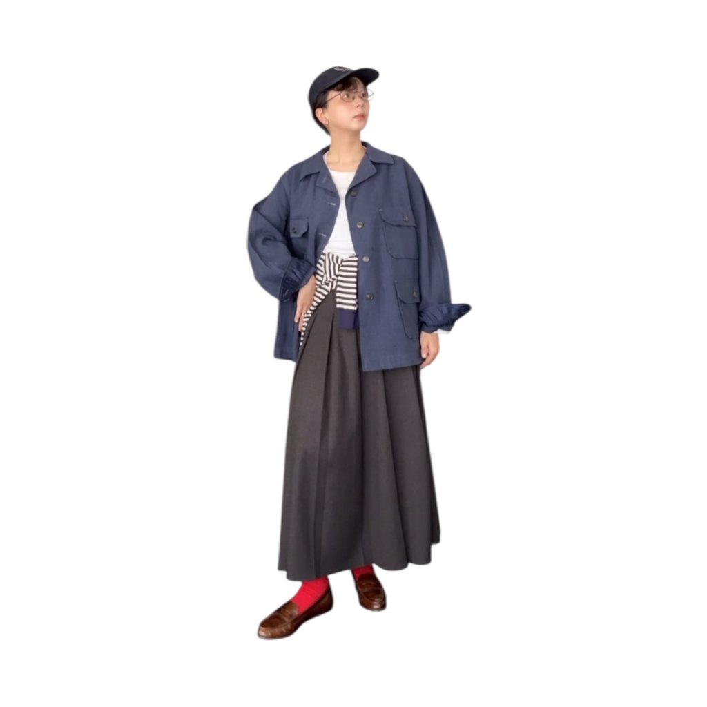 スカートと合わせることでメンズライクかんが抑えられて品よく見えます。