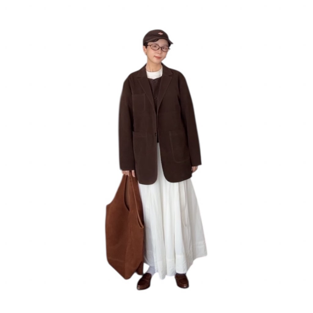 カジュアルすぎないスウェードライクなジャケットと鞄に白のスカートは