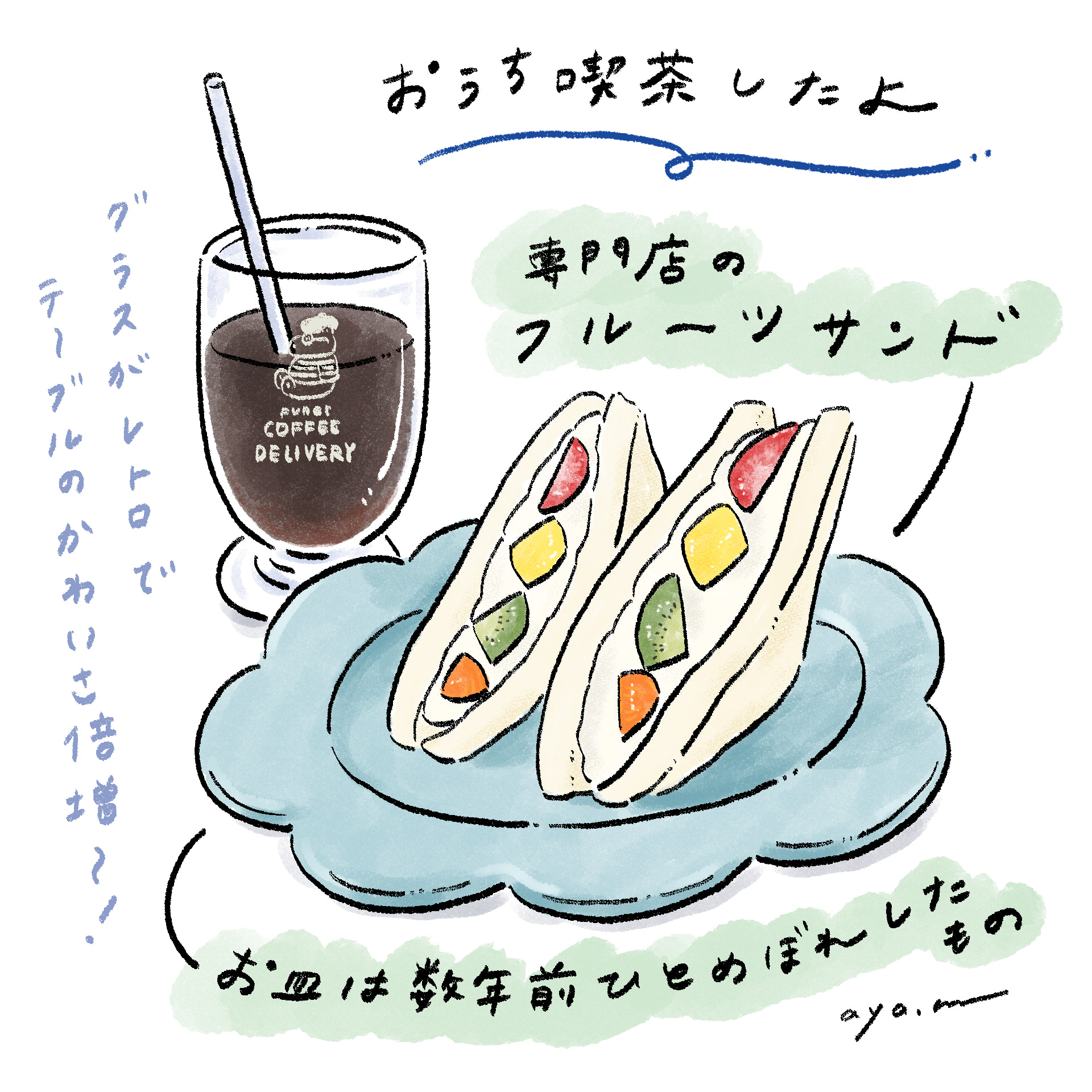 形の可愛いグラスは、あの「アデリアレトロ」シリーズで知られる「アデリア」さんに特注されたとのことで、これはおうち喫茶がしたい!とフルーツサンドを選びました。