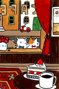 この日は、どこかの街角で美味しそうなケーキに夢中なわんちゃんたちのイラストを思いついたので描いてみたよ。