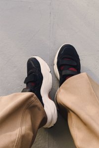 スニーカーサンダルのほうは、カラー靴下と合わせて履いていた。ぽってりフォルムで夏はハーフパンツとの相性もバツグン。