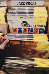 ガラス張りのドアから見える、所狭しとCDやレコードがひしめく店内にわくわく。