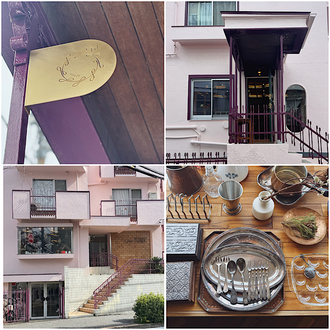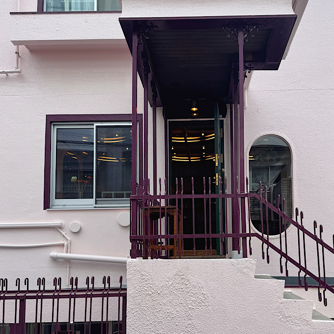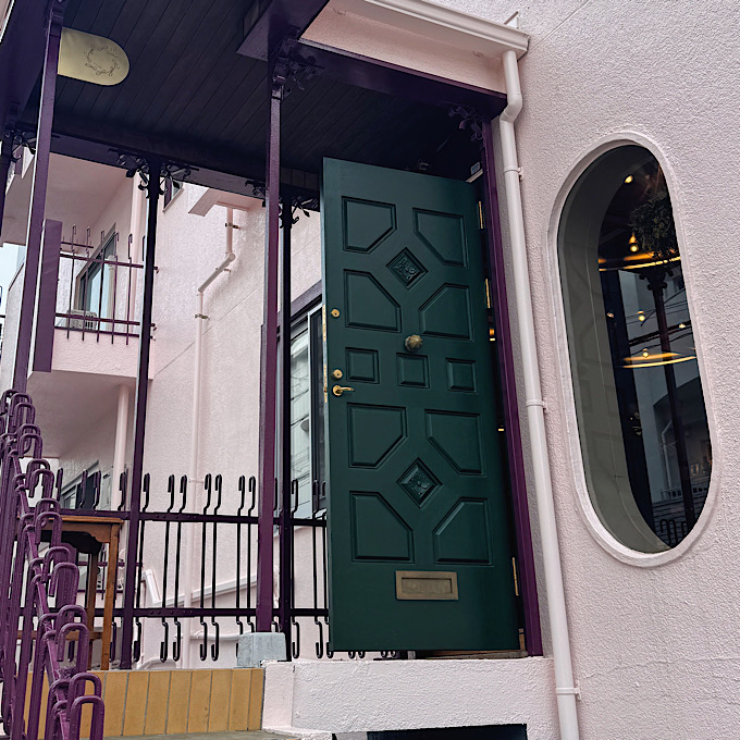 レトロな風合いの淡いピンクの壁に、深いグリーンの扉。そして絶妙なパープルの鋳鉄。この色のコントラストがなんと可愛らしいこと!店内に入る前からワクワクと胸が高鳴ります。