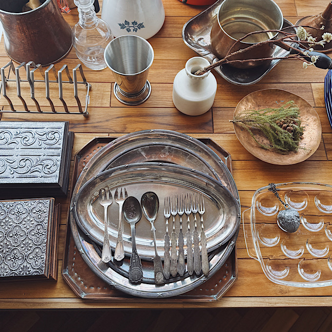 使い込まれたシルバーのティースプーンやフォーク、繊細な模様が施された小物入れ、小鍋など、時を超えてやってきたのに、今の私たちの暮らしにスッと馴染んで、毎日を少しだけ特別にしてくれそうなものばかり。