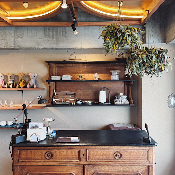 窓際には、オーナーさんがヨーロッパ各地で買い付けたヴィンテージの食器やカトラリー、小物類が並んでいました。