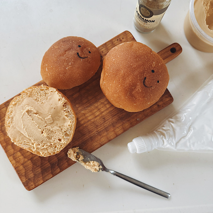 早速、お家でも”スウェーデンごっこ”開始。パンは市販のパン。カルダモンはパウダーで代用。うちにピーナッツクリームがあったので、アーモンドペーストの代わりに、あとは生クリームもホイップしたもので!これなら簡単に北欧のおやつの雰囲気を楽しめます。ピーナツクリーム(ピーナツバターでも)をたっぷり塗り、カルダモンパウダーもしっかりふりかけ、その上にホイップを絞り出せば完成です。