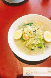 鶏ガラ&豚骨ベースのスープに春雨が入っている。お野菜たっぷりで、さっぱりと食べられる。一番驚いたのは、具材のエビのプリプリ感!海の味がとても濃くて美味しい。紅蘭亭は1934年創業の老舗中華料理店。お昼時はかなりの列ができるので、整理券をとってからお散歩をながら待つのがオススメ。