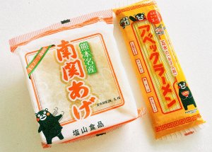 旅先ではご当地スーパーのチェックも欠かさない。熊本産のものにはパッケージにくまモンが描かれているものが多い。お土産探しに一役買っているくまモン。