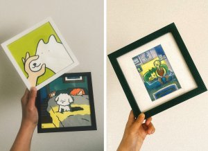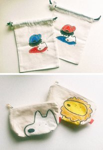 イラスト原画の展示販売に加えて、イラストグッズもたくさんご用意しています。手描きイラストいりのグラスや巾着、ポーチなど。日常で使って頂けるアイテムのほか、レコード盤のようにラッピングしたリーズナブルなミニ原画、さらにお店とのコラボグッズも登場します。