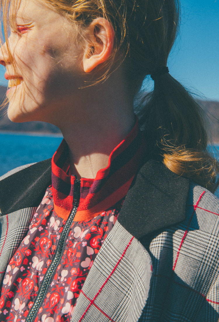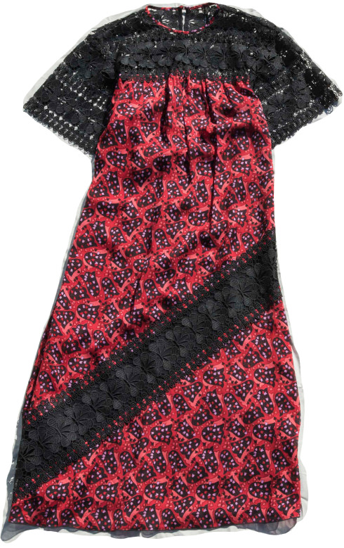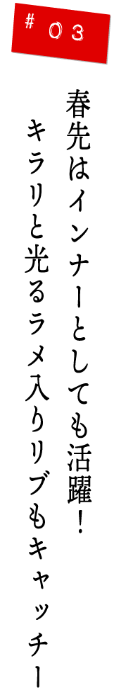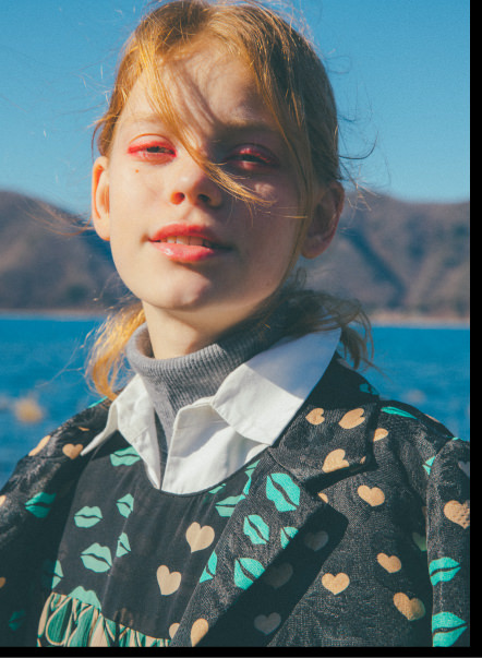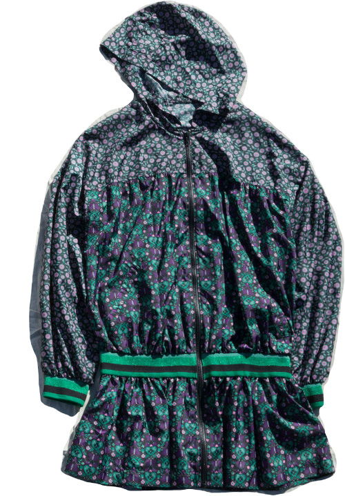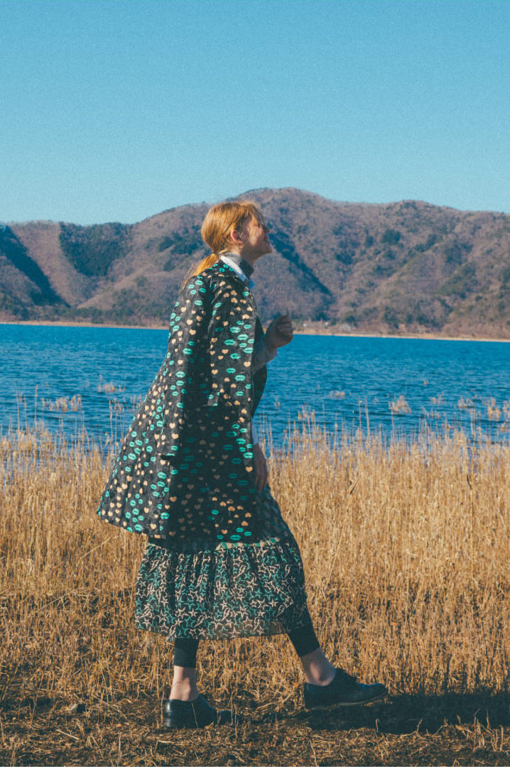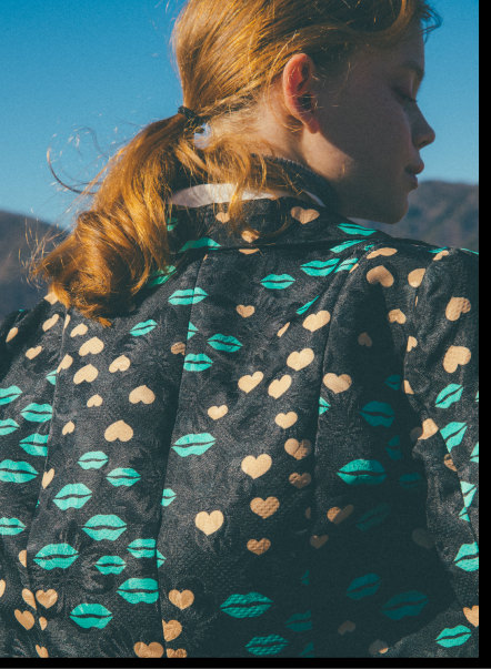 キスマークやハートなど、プレイフルなモチーフを散りばめたマキシ丈ワンピースと、ジャガード織りのロングジャケットをセットアップのように着こなして。柄ON柄スタイルは色のトーンを揃えると統一感がアップします。キーカラーのジェードグリーンも春らしさ満点!