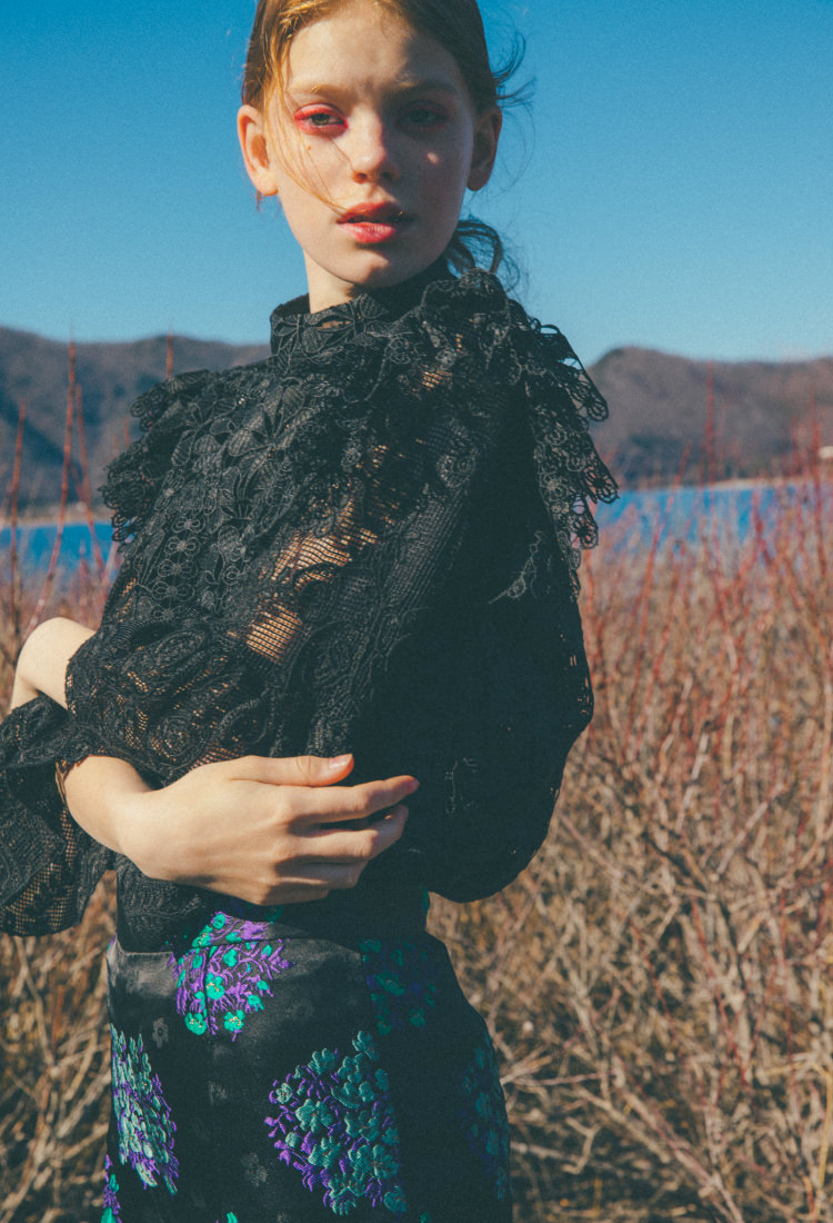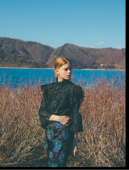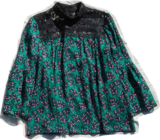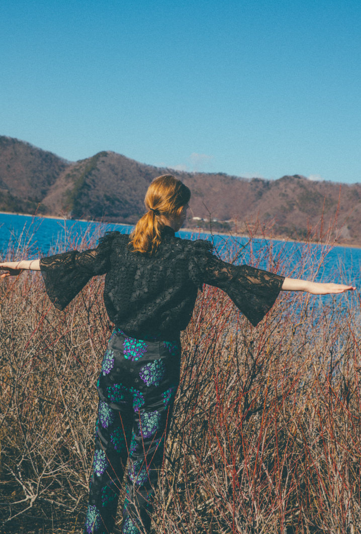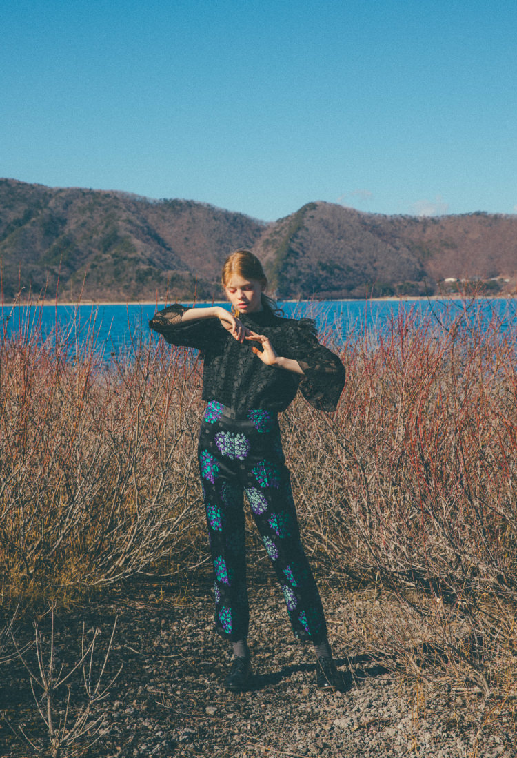 美しいサテンパンツは、「TOSSED BOUQUET」という名の通り、花束のような華やかなモチーフを光沢感とハリ感のあるジャガード素材で表現。繊細なレースのブラウスと合わせて、思いっきりロマンティックに着こなすのがおすすめです。