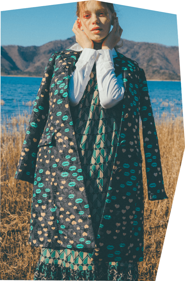 キスマークやハートなど、プレイフルなモチーフを散りばめたマキシ丈ワンピースと、ジャガード織りのロングジャケットをセットアップのように着こなして。柄ON柄スタイルは色のトーンを揃えると統一感がアップします。キーカラーのジェードグリーンも春らしさ満点!