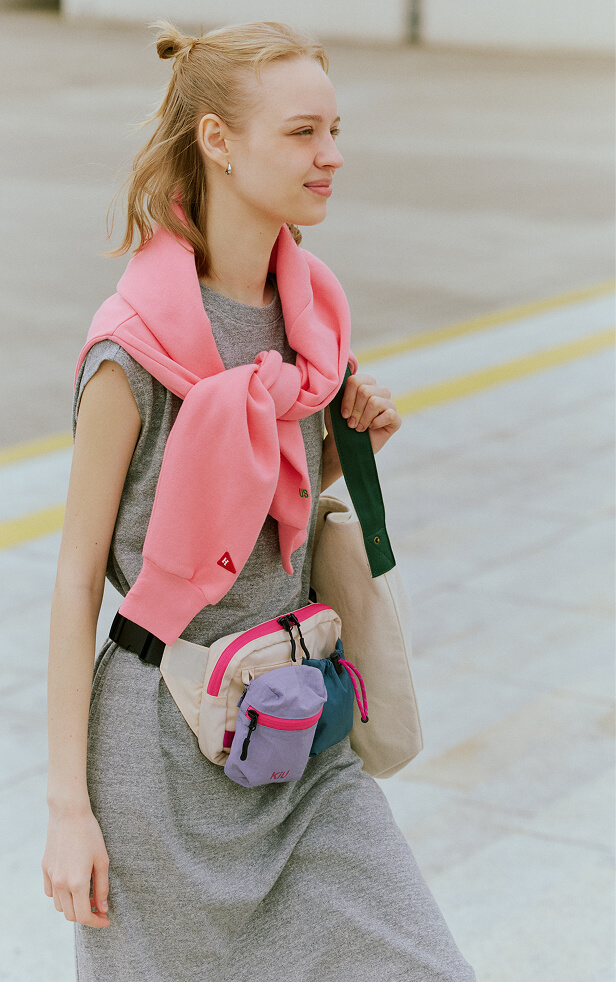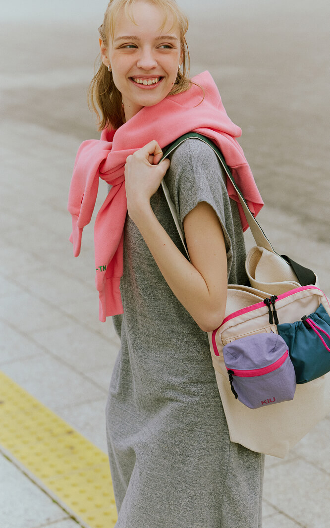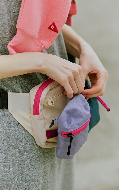 ピンクやパープルの配色が、ワンピーススタイルをリズミカルに彩るミニボディバッグ。腰に巻いてワンポイントにするのもよし、トートバッグの持ち手に取り付けて、オリジナリティ溢れるアイデアで楽しむのもおすすめ。