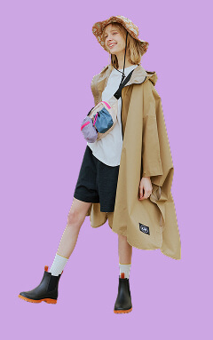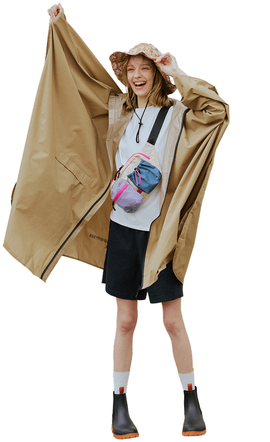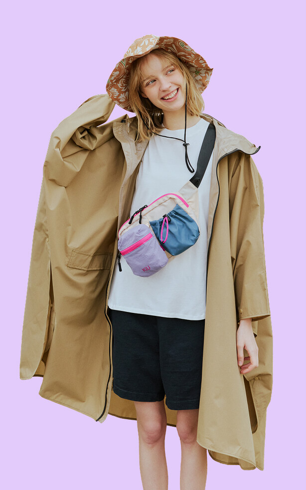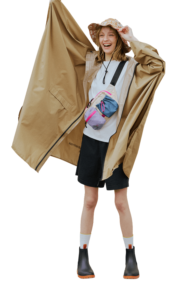 フェスシーンではボディバッグを斜め掛けしてみよう。よりフィット感が増して、アクティブに動くことができるはず。荷物を小分けして収納できるところもうれしいポイント。レインポンチョやブーツも揃えたら準備は完璧!