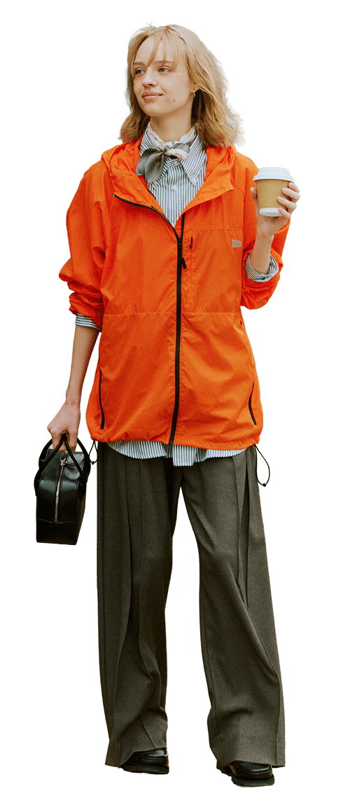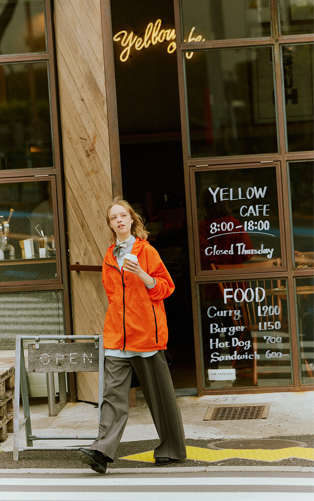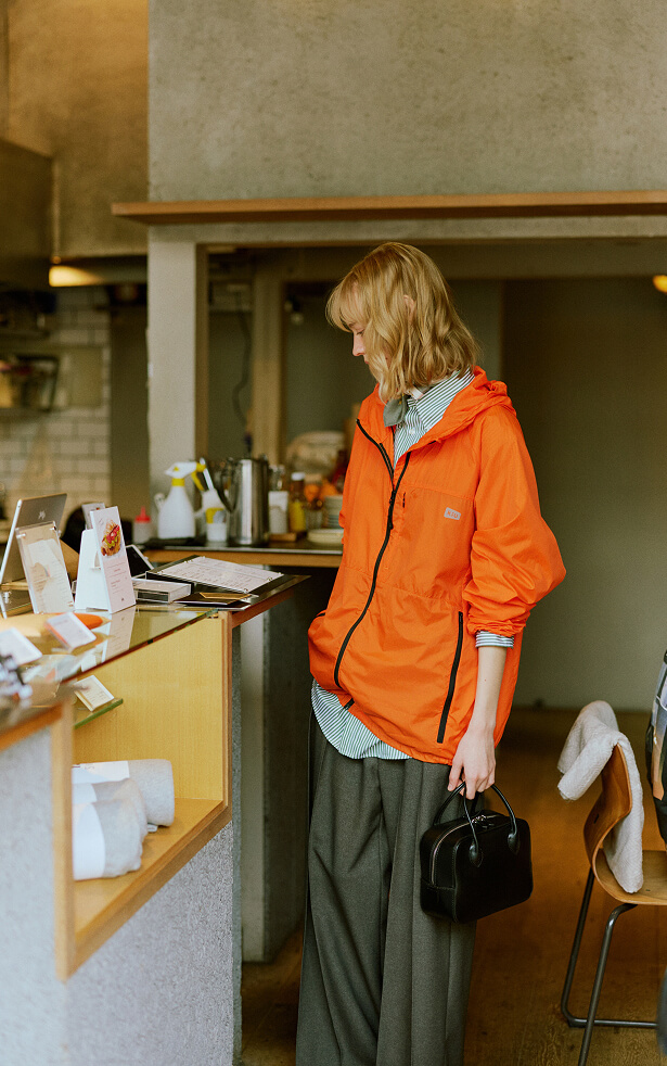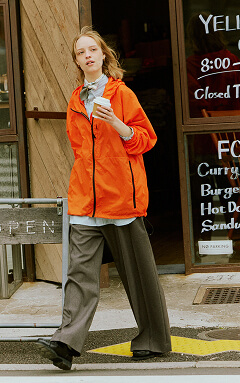 シャツ×スラックスの端正な着こなしにフーディーをプラス。ビビッドなオレンジやリップストップ生地ならではの素材感が、きちんと感のあるスタイルを新鮮な表情へ導いてくれる。首もとのスカーフでレディな抜け感も忘れずに。
