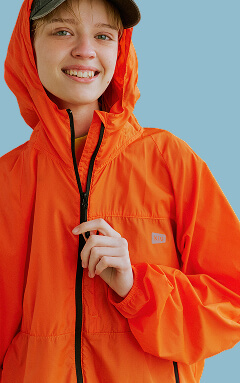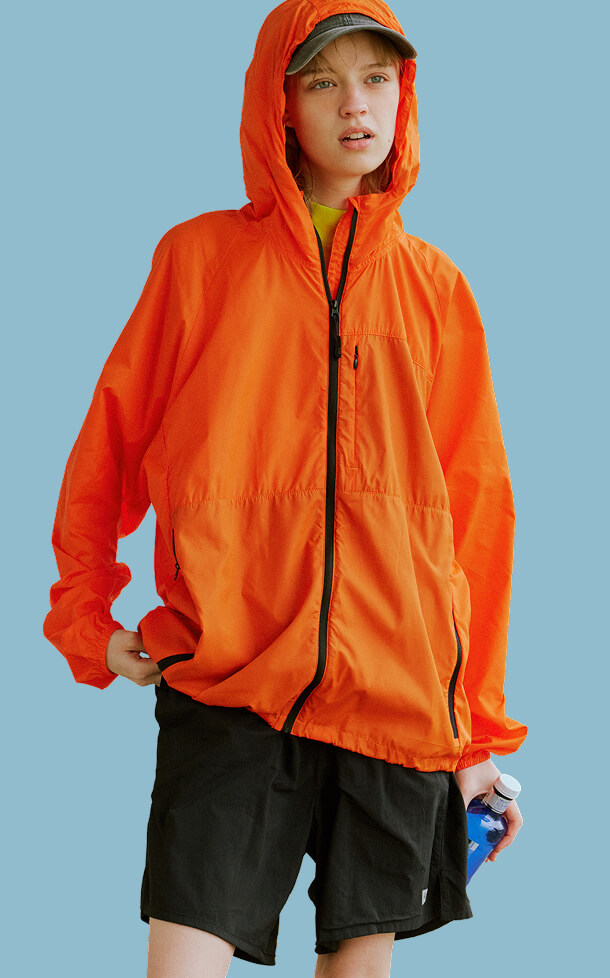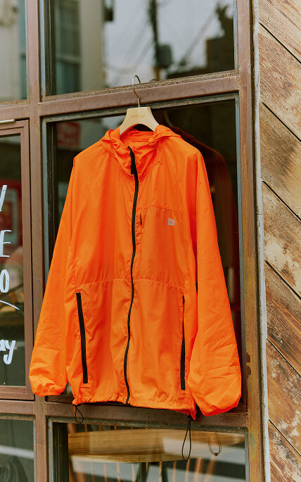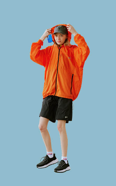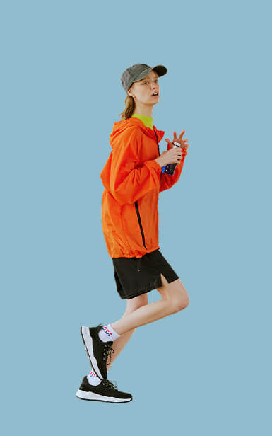 フレッシュなオレンジのフーディーがあれば、ランニング気分も上々!首もとからちらりとライム色のカットソーをのぞかせると、こなれ感がアップ。前後にリフレクターのワンポイントが入っているから、夜道でも安心。