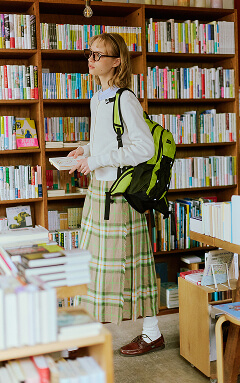 アクティブなバックパックで、知的なムードを一新。難しそうな組み合わせも、バックパックとチェック柄スカートの色味をさり気なくリンクさせることで難なくまとまる。カチューシャやメガネの小物でスマートに引き締めて。