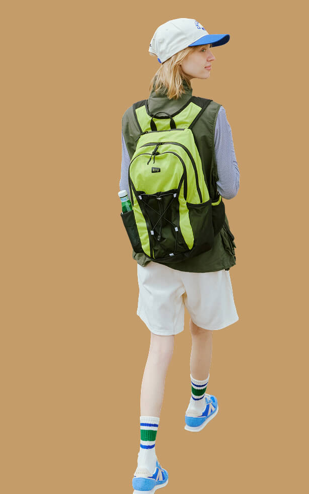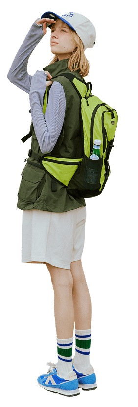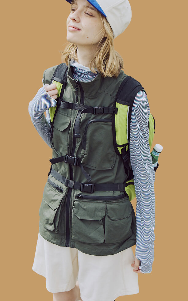 軽やかなバックパックでハイキングに出かけよう!ウエストベルトで身体にしっかり固定できるから動きやすさも抜群。フロントのバンジーコードには脱いだ上着をはさみかけておけて便利。お洒落で快適にサポートしてくれる。
