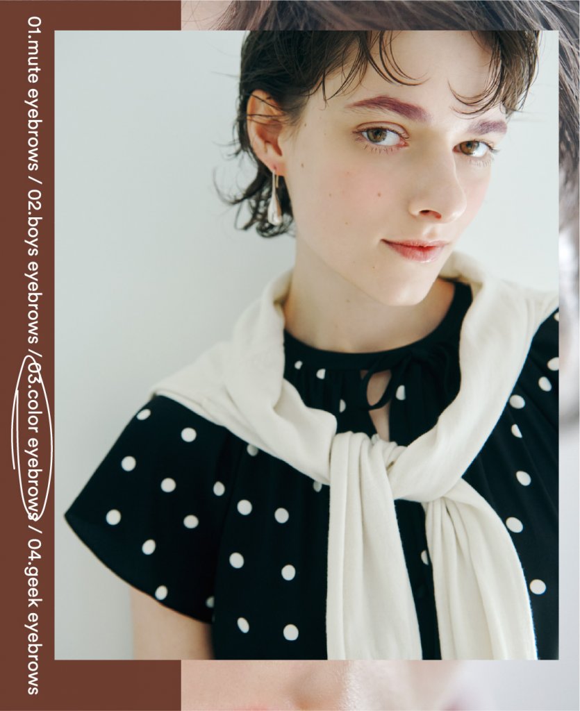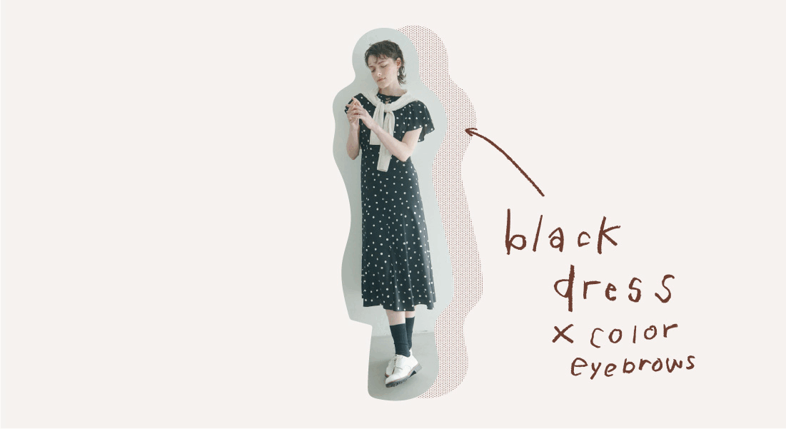 時にはブラックワンピースで女性らしい雰囲気を楽しんで。落ち感が美しいドット柄のワンピースを主役に、モノトーンでシックにまとめると◎。より洗練された雰囲気にアップデートしたいなら、モノトーンを引き立てる鮮やかなカラー眉に挑戦してみて。