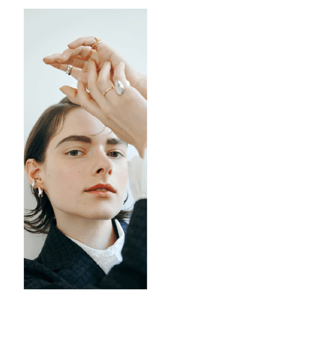 ジャケット¥62700/BRITISH MEDE (ブリティッシュメイド 青山本店)、ブラウス¥46200/Bilitis dix-sert ans (ビルティス)、オーバーオール¥39600/OMNIGOD (ドミンゴ)、シューズ¥70400/SANDERS (サンダース ジャパン)、ピアス¥49500、イヤカフ(右耳)¥29700、イヤカフ(左耳)¥16500/ともにRieuk (リューク)、薬指リング(右手)¥26950/PLUIE (プリュイ トウキョウ)、小指リング(右手)¥29700、人差し指リング(左手)¥31900/ともにRieuk (リューク)、薬指リング(左手)¥32450、小指リング(左手)¥36300/ともにPLUIE (プリュイ トウキョウ)