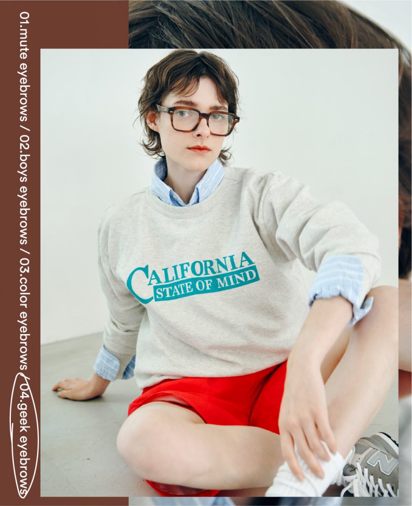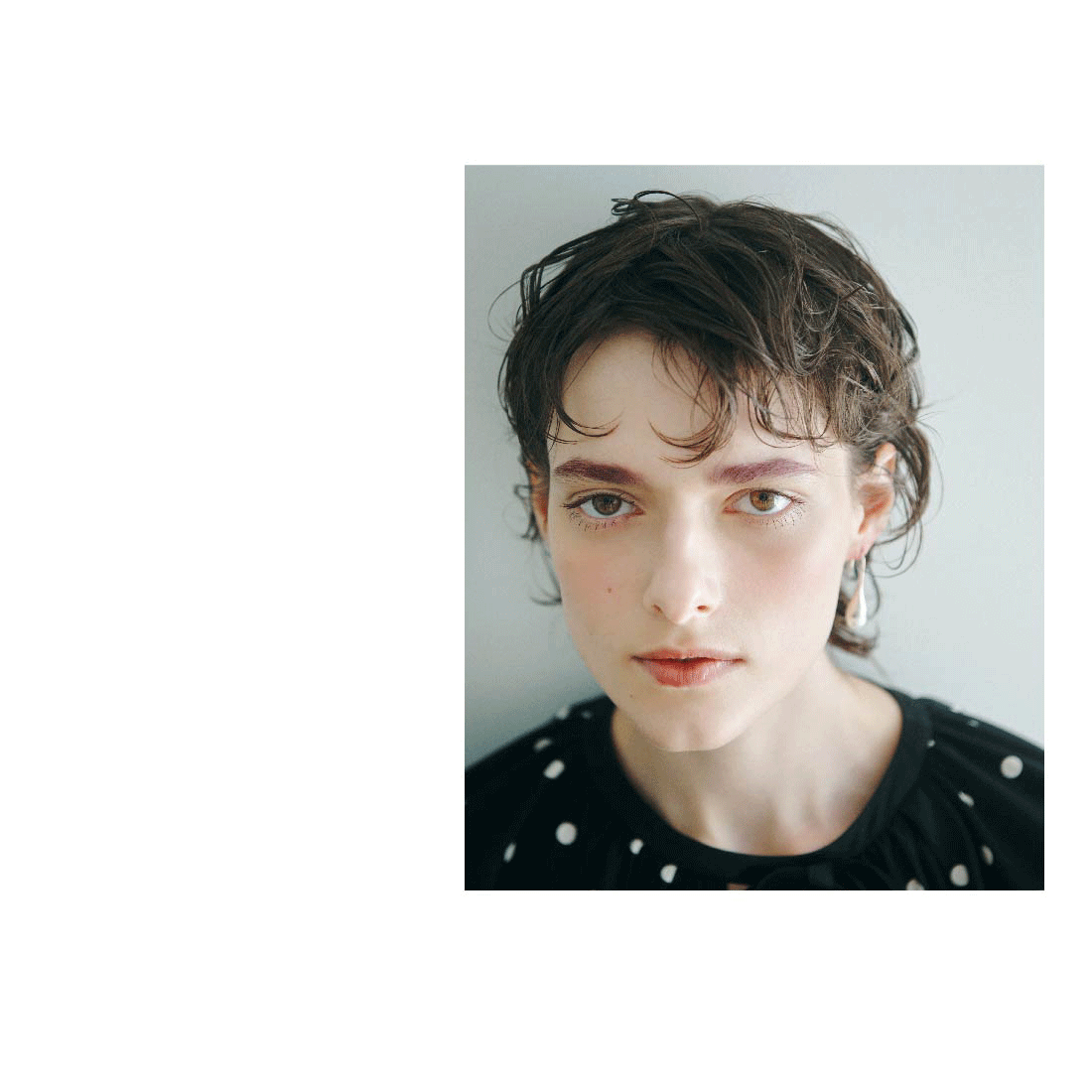 直線的なフレームに合わせて平行眉に、さらに海外のギークガールのように敢えてぼさぼさな眉毛がフレームから覗くとキュート!チークは自然な血色感をプラスして、リップは肌に溶け込むようなブラウンのセミマットでアクセントに。ニュアンスカラーでギークさの中にお洒落感を忍ばせて。