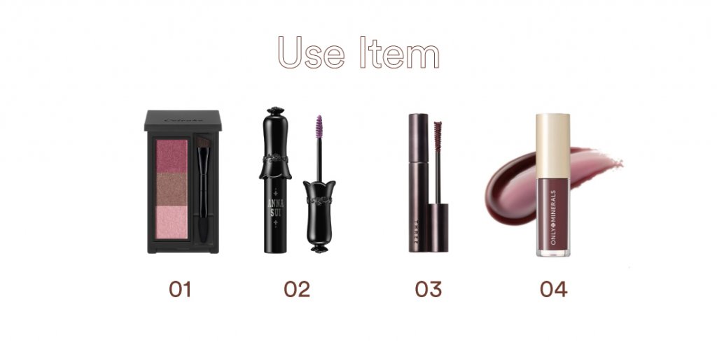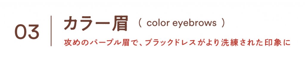 カラー眉初心者さんには、奇抜になりすぎず挑戦しやすい“パープル”をチョイス。他のポイントメイクも眉毛と同系色の色でまとめるとバランスよく仕上がります。上下のまつ毛にカラーマスカラをたっぷり塗ってぱっちりと、リップはグロスでシアーにすることでモードになりすぎずチャーミングに。