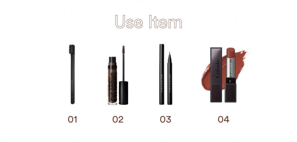 1.髪の色よりワントーン明るめのアイブロウマスカラをチョイス!今回は二ュアンスカラーで自眉の色味を抑える《ADDICTION》のアイブロウマスカラを使用。眉の毛並みに沿って表面を塗る。