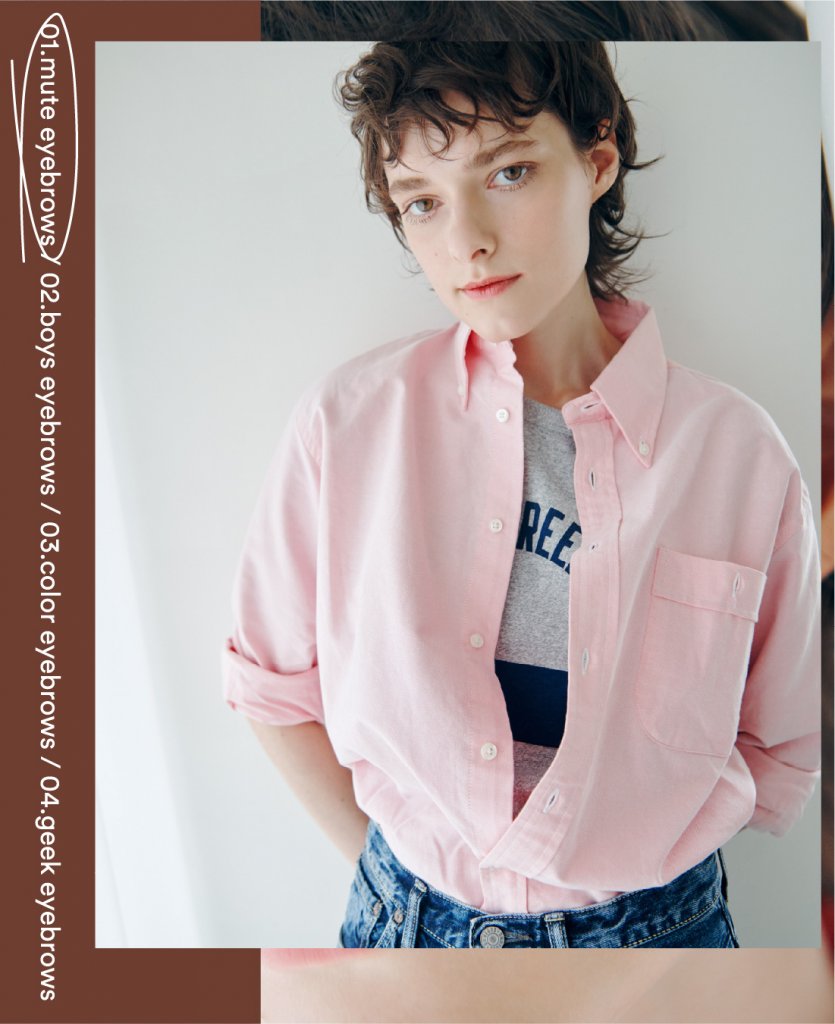 ベーシックなTシャツ+デニムに、秋めいてきたら淡いピンクのシャツを合わせて差し色に。そんな定番のカジュアルスタイルは、眉を色素薄めにふんわりミュートさせると新鮮で今っぽい印象に。抜け感のある眉毛にすることで、ファッションとメイクがぐっと際立ちます。