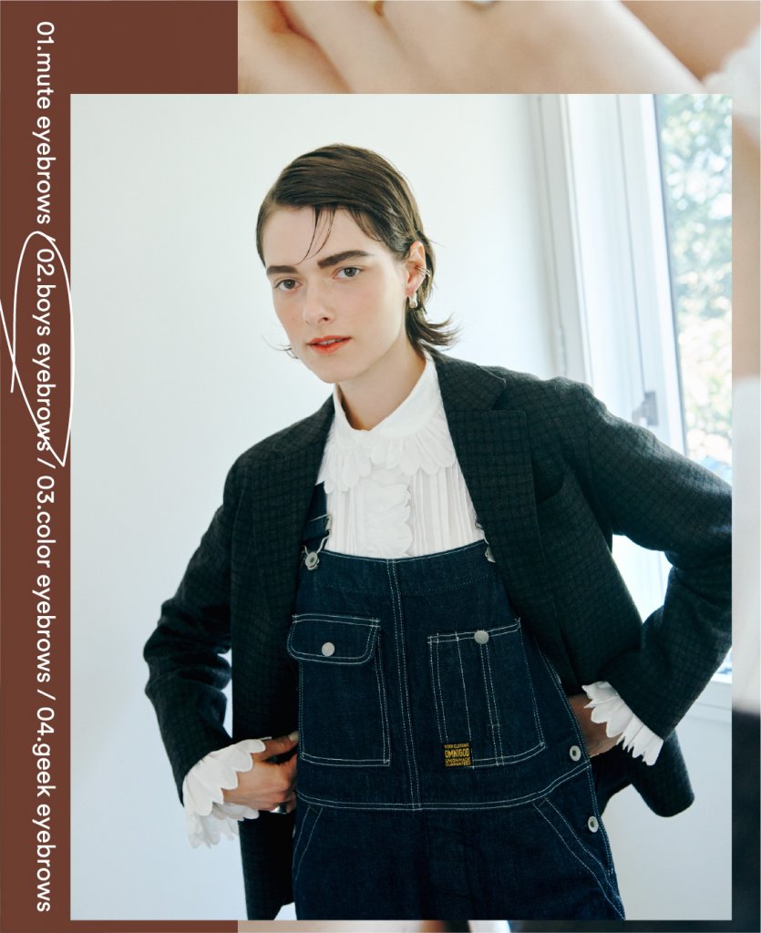 気分が上がる秋のおしゃれアイテム、フリルブラウス。ジャケットやオーバーオールを合わせて甘辛のバランスを楽しんで。さらに太め・長めのストレート眉で全体のバランスを引き締めることで、ぐっと垢抜けた雰囲気に!キリッと男の子っぽい眉毛が主役なので他のポイントメイクはシアーな色味に抑えてノーブルに。