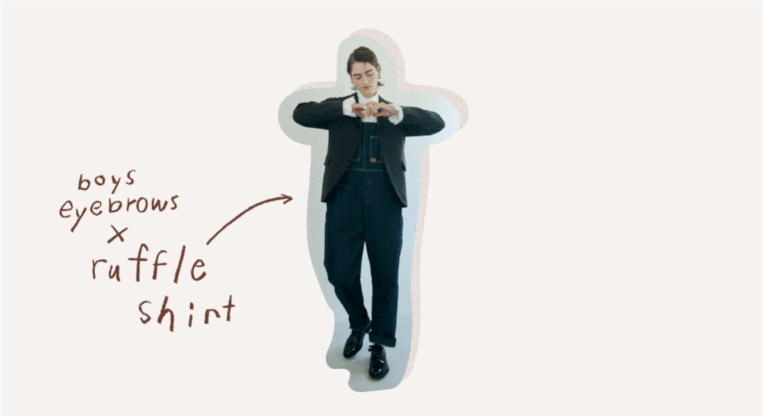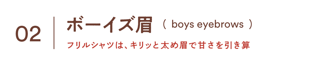 気分が上がる秋のおしゃれアイテム、フリルブラウス。ジャケットやオーバーオールを合わせて甘辛のバランスを楽しんで。さらに太め・長めのストレート眉で全体のバランスを引き締めることで、ぐっと垢抜けた雰囲気に!キリッと男の子っぽい眉毛が主役なので他のポイントメイクはシアーな色味に抑えてノーブルに。